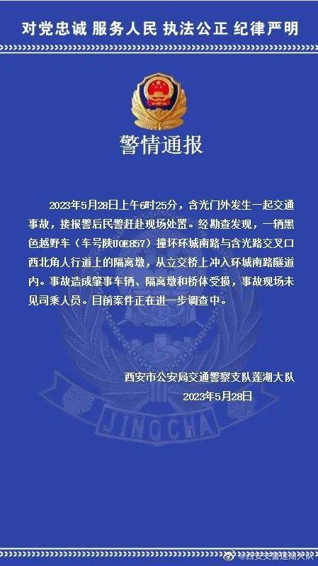 2023年5月28日上午6时25分,含光门外发生一起交通事故,接报警后民警赶赴现场处置。经勘查发现,一辆黑色越野车(车号陕U0E857)撞坏环城南路与含光路交叉口西北角人行道上的隔离墩,从立交桥上冲入环城南路隧道内。 事故造成肇事车辆、隔离墩和桥体受损,事故现场未见司乘人员。目前案件正在进一步调查中。