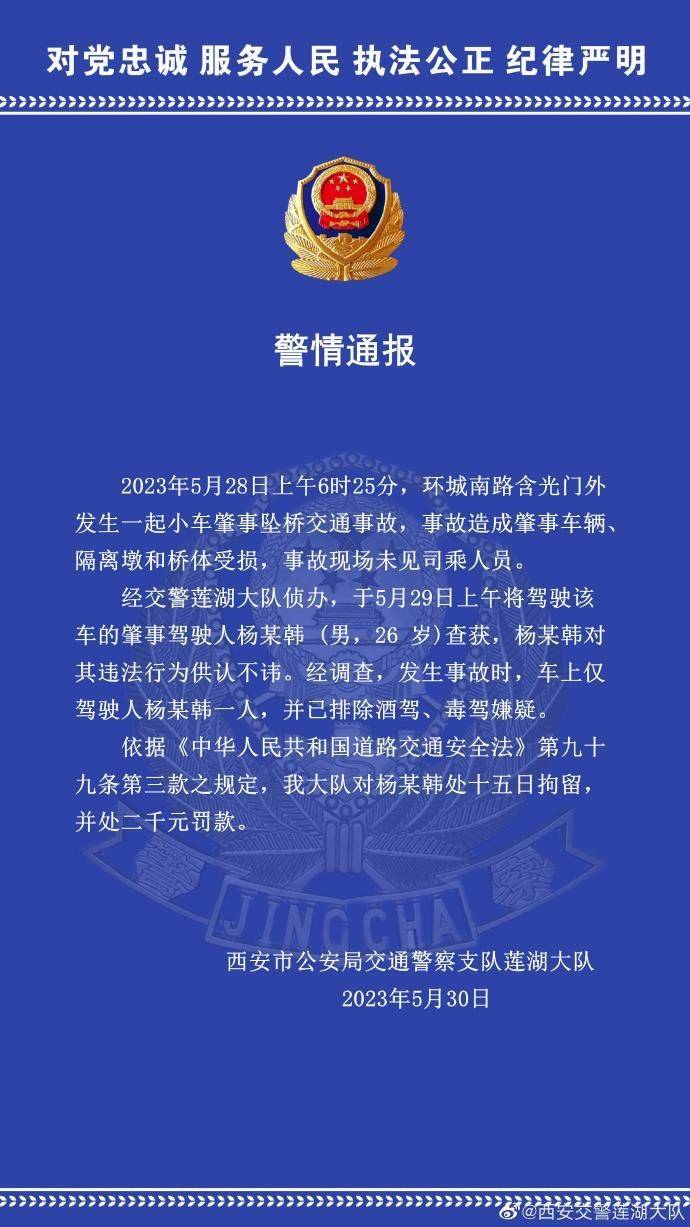 经交警莲湖大队侦办,于5月29日上午将驾驶该车的肇事驾驶人杨某韩(男,26岁)查获,杨某韩对其违法行为供认不讳。经调查,发生事故时,车上仅驾驶人杨某韩一人,并已排除酒驾、毒驾嫌疑。