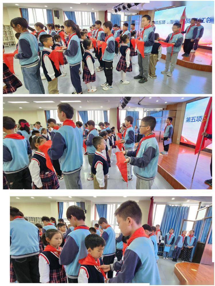 在欢快的乐曲声中,优秀少先队员手捧着象征光荣和使命的红领巾,为新队员们一一佩戴上鲜艳的红领巾。佩戴过程安静又整齐,这不仅是一种仪式,更是一种责任的继承、使命的传递。新老队员互相敬队礼,鲜艳的红领巾挂在胸前,这是多么自豪又神圣的一刻。