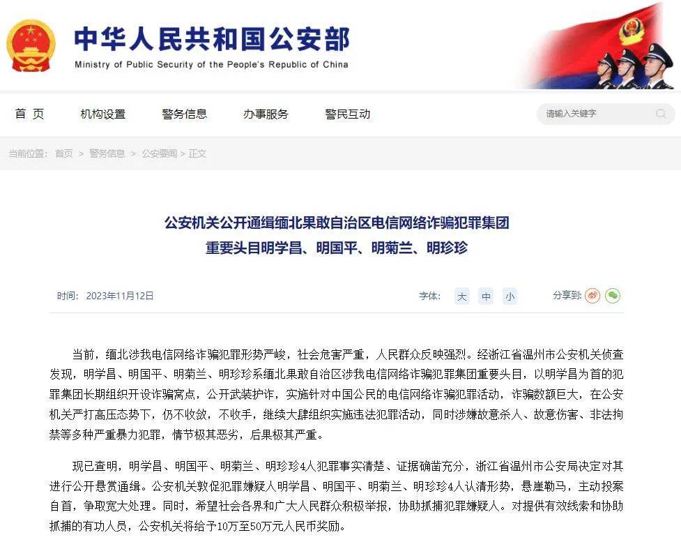 据公安部网站11月12日消息,公安机关公开通缉明学昌、明国平、明菊兰、明珍珍4名缅北果敢自治区电信网络诈骗犯罪集团重要头目。对提供有效线索和协助抓捕的有功人员,公安机关将给予10万至50万元人民币奖励。