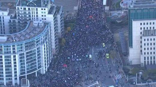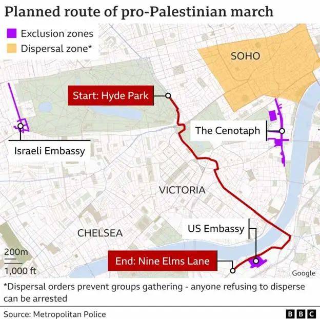 根据英国广播公司(BBC)和《卫报》报道,当地时间11月11日正值“英联邦国家停战纪念日”,当天中午12时许,数十万抗议者从伦敦市中心海德公园附近出发,向位于伦敦西南部的美国大使馆前进。