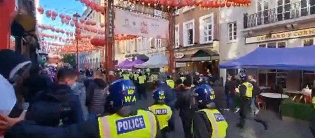 抗议者在中国城、白厅和平纪念碑和威斯敏斯特地铁站前与警察发生冲突,图自社交媒体
