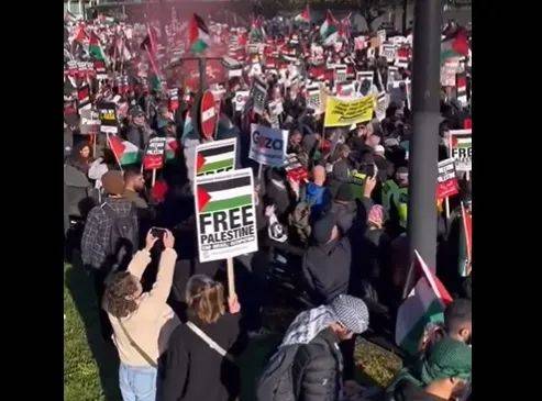 现场图片和视频显示,抗议者手举巴勒斯坦旗帜,以及“解放巴勒斯坦”、“解放加沙”和巴勒斯坦民族主义使用的“从河流到大海”等标语,高呼“立即停火”“停止杀害无辜平民”等口号。