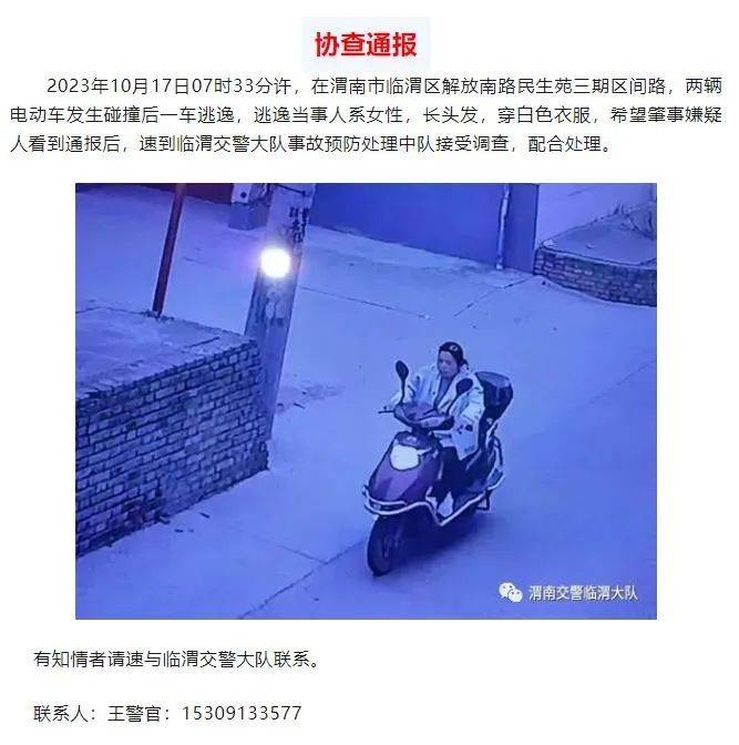 2023年10月17日07时33分许,在渭南市临渭区解放南路民生苑三期区间路,两辆电动车发生碰撞后一车逃逸,逃逸当事人系女性,长头发,穿白色衣服,希望肇事嫌疑人看到通报后,速到临渭交警大队事故预防处理中队接受调查,配合处理。