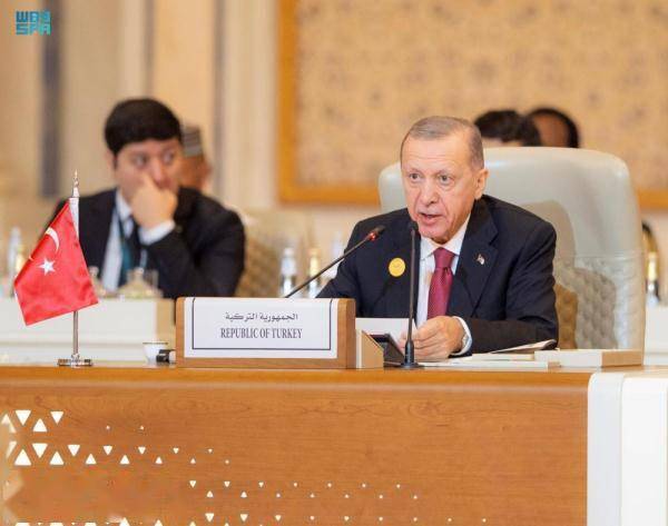 11月11日,在沙特阿拉伯首都利雅得,土耳其总统埃尔多安出席阿拉伯-伊斯兰国家领导人联合特别峰会。新华社发(沙特通讯社供图)