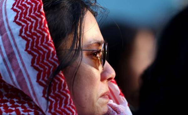 11月11日,在英国伦敦,一名女子听到在巴以冲突中遇难的儿童姓名时落泪。新华社记者李颖摄