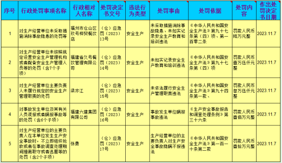 同日,福州市仓山区应急管理局发布“2023年行政处罚公示(十三-十七)”。本次行政处罚涉及三家单位和两个个人。