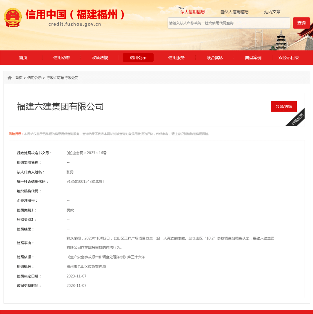 11月7日,信用中国(福建福州)曝光了一则行政处罚消息。内容显示,因群众举报,2020年10月2日,仓山区正祥广场项目发生一起一人死亡的事故。经仓山区“10.2”事故调查组调查认定,福建六建集团有限公司存在瞒报事故的违法行为。