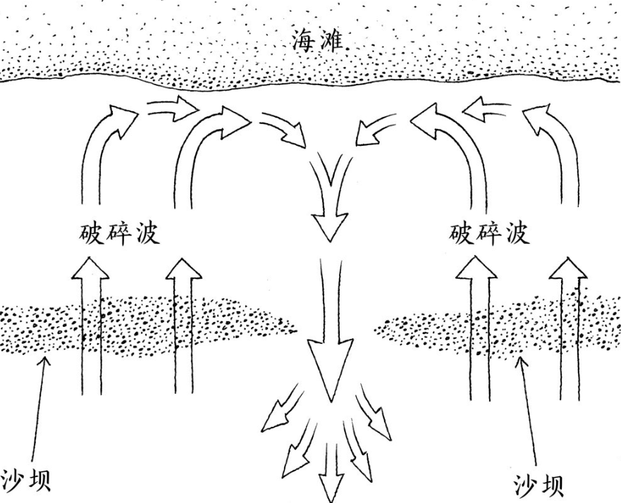 若沙岸环境较为平缓,海水缓慢回落,不会出现强劲的离岸流。但如果沿着海岸有沙脊或沙洲,沙脊或沙洲与海岸间又构成了狭长的凹陷带或海沟时,海水就容易在凹陷带中聚集起来,越聚越多,最终大量的海水就会从沙脊或沙洲上的某几处较低的缺口冲出,形成强劲的离岸流。