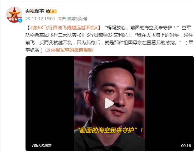 “妈妈放心,前面的海空我来守护!”空军航空兵某团飞行二大队轰-6K飞行员穆特发·艾利说:“我在去飞海上的时候,越往前飞,反而我就越不慌,因为我身后,就是那种祖国母亲在罩着我的感觉。”(军事纪实)