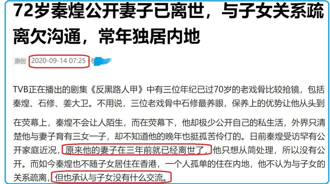 秦煌老来孤独,是因为家庭不和睦。秦煌23岁那年就娶了电台主播莫佩雯,并在对方的引荐下进入影视圈,两人育有三女一子。秦煌拍戏非常忙,多年来冷落了家人,他后来还多次传出绯闻,让莫佩雯难以忍受。
