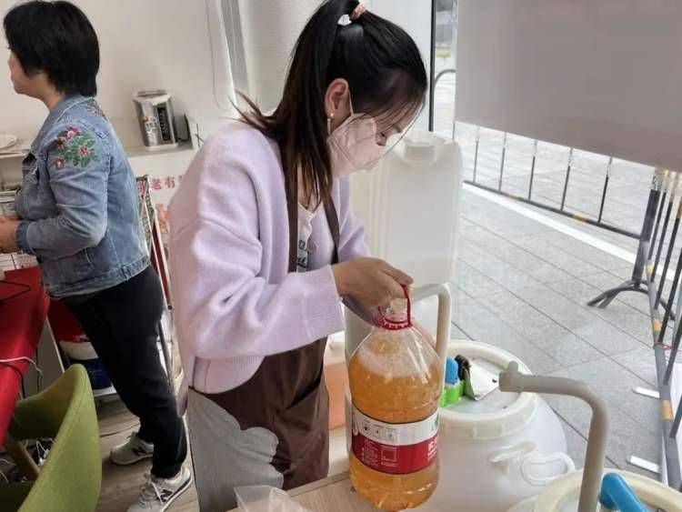 前来购买零拷洗衣液的居民,都有自带塑料瓶等容器。家住大桥街道的居民沈女士,自备了一个5升容量的矿泉水瓶,灌满了檀香皂液。“自从杨树浦门店关闭后就一直在等重新开放,没想到新店还是在大桥街道。我们相信老牌子,一直用着这种洗衣液。”