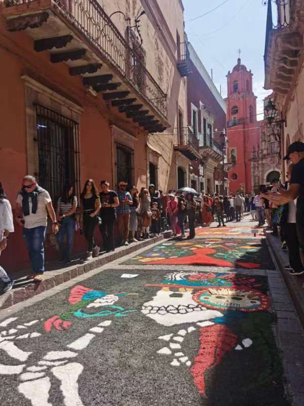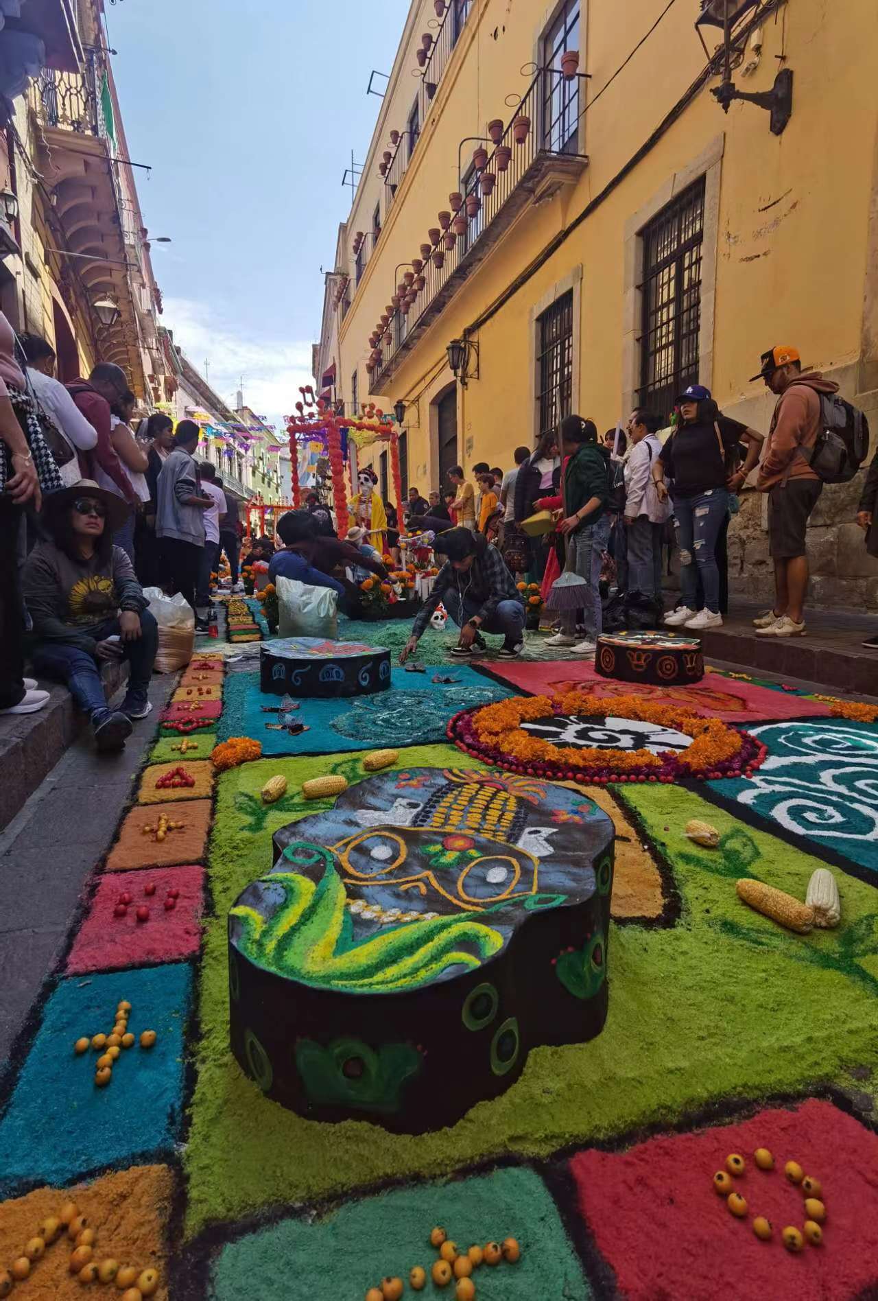 万寿菊与蜡烛布满了圣母圣殿的石阶,为亡灵指引着回家的路;用鲜花、石子和木屑铺就的画作占据了城市主街,那是民间艺术家对死亡的诠释;黄昏时分登上皮皮拉山,落日的余晖将瓜纳华托的浓墨重彩渲染到极致;华灯初上,在这个依山而建、因矿而兴的城市中,昔日矿道改造而成的地下动脉里,属于亡灵节的狂欢才真正开始。人们穿着印有白骨的黑色服装,再绘上一张或狰狞或妖娆的“鬼脸”,在街上招摇过市,以示亡灵归来……火树银花的城市、无处不在的骷髅与万寿菊、陶醉在音乐中的街头艺人、在人群中穿梭的野犬、从容凝视这一切的老人,让人恍若进入了《寻梦环游记》的世界。