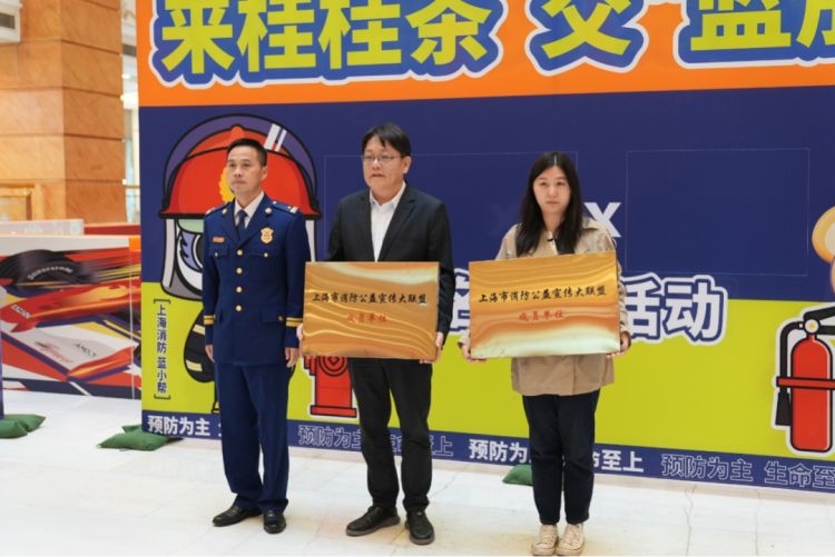 当天启动仪式中,普陀区消防救援支队为上海环球港、桂桂茶授消防宣传大联盟优秀合作单位奖牌。市消防救援总队还与桂桂茶企业为活动主背景粘贴联合标志。