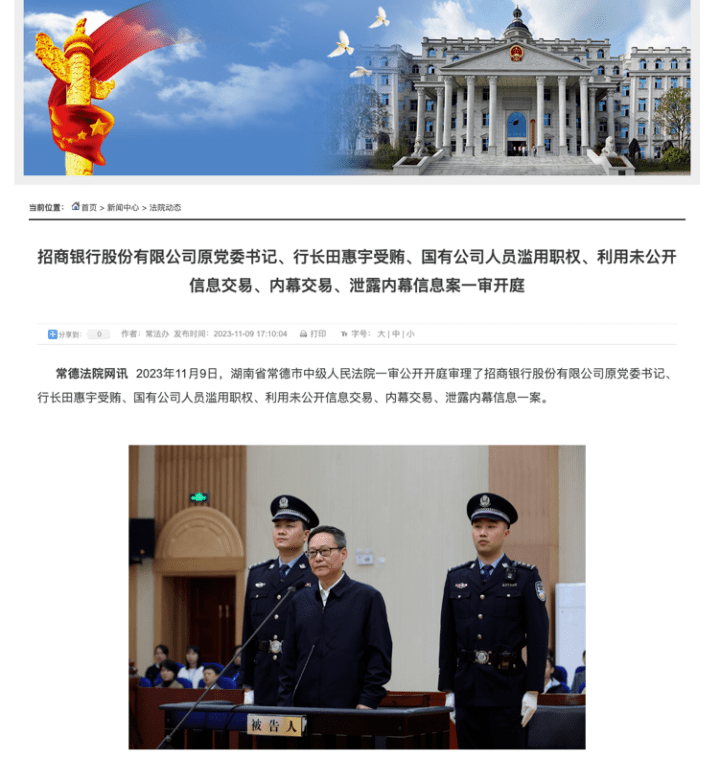 据常德市中级人民法院网站消息,11月9日,湖南省常德市中级人民法院一审公开开庭审理了招商银行股份有限公司(下称“招商银行”,股票代码600036.SH,03968.HK)原党委书记、行长田惠宇受贿、国有公司人员滥用职权、利用未公开信息交易、内幕交易、泄露内幕信息一案。