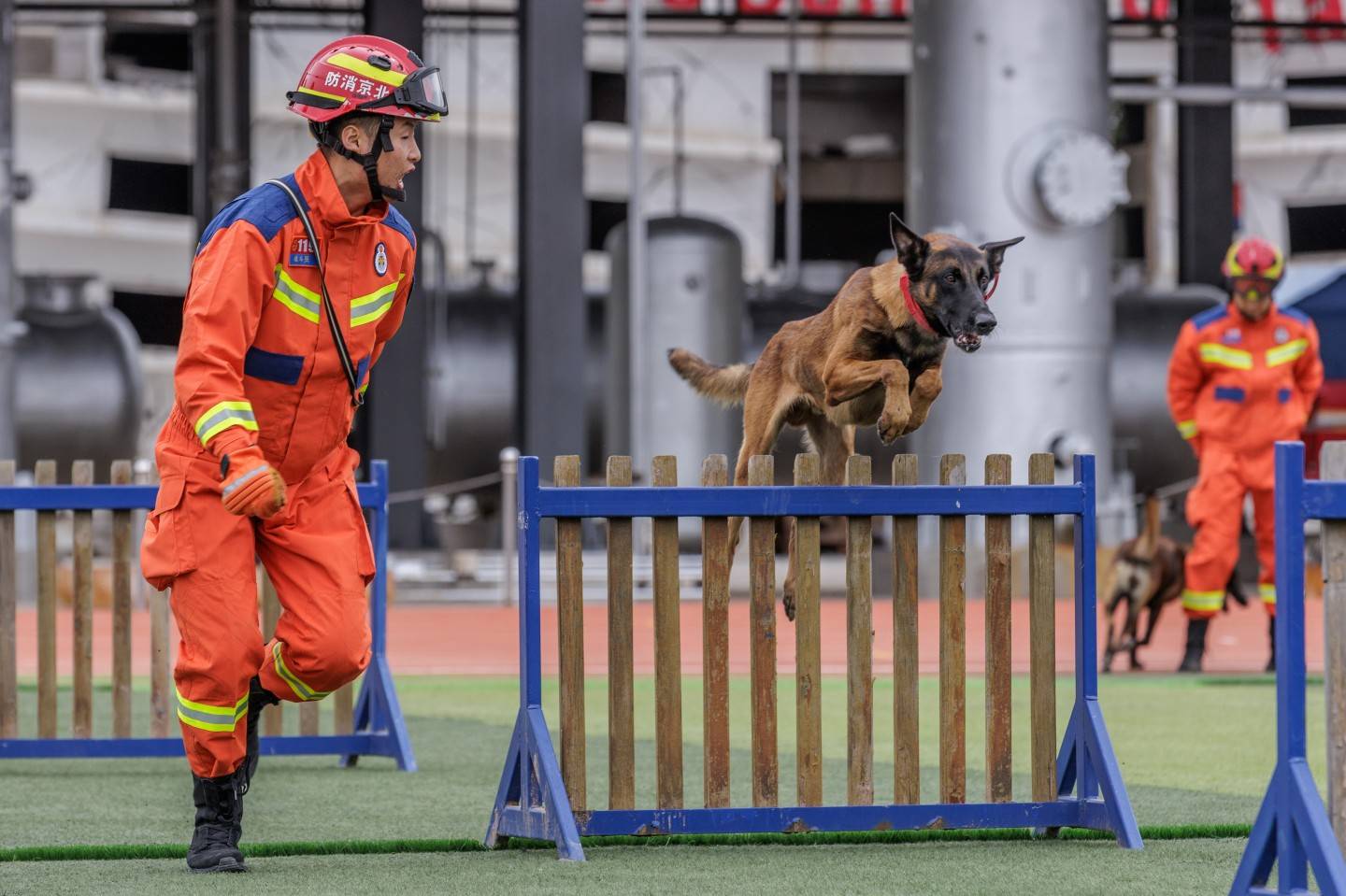 2023年9月19日,北京市第二届消防行业职业技能竞赛现场,搜救犬驯导员竞赛项目,消防员带领搜救犬跨越障碍。新京报记者 王子诚 摄
