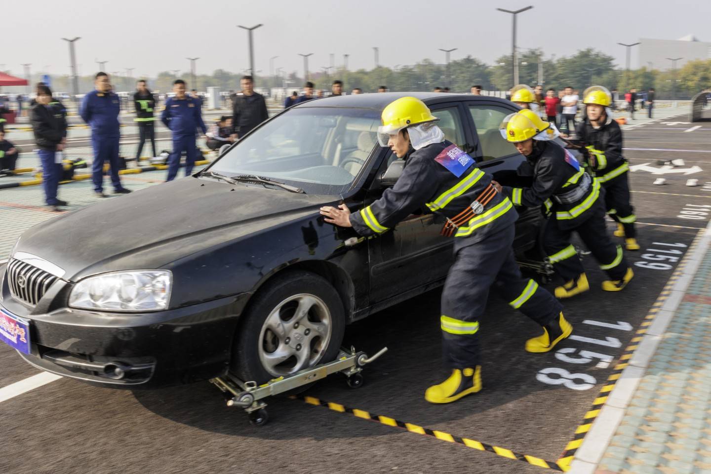 2023年10月24日上午,通州区自防自救力量2023年秋季消防技能竞赛举行。团体赛项目,选手正在使用移车器移车。新京报记者 王子诚 摄
