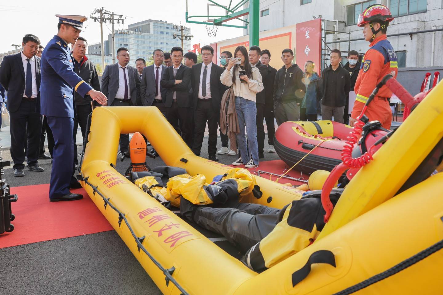 2023年11月3日,通州区在梨园镇云景东路小型消防站举行全区“119”消防宣传月启动仪式,嘉宾参观冰面救援设备。新京报记者 王子诚 摄