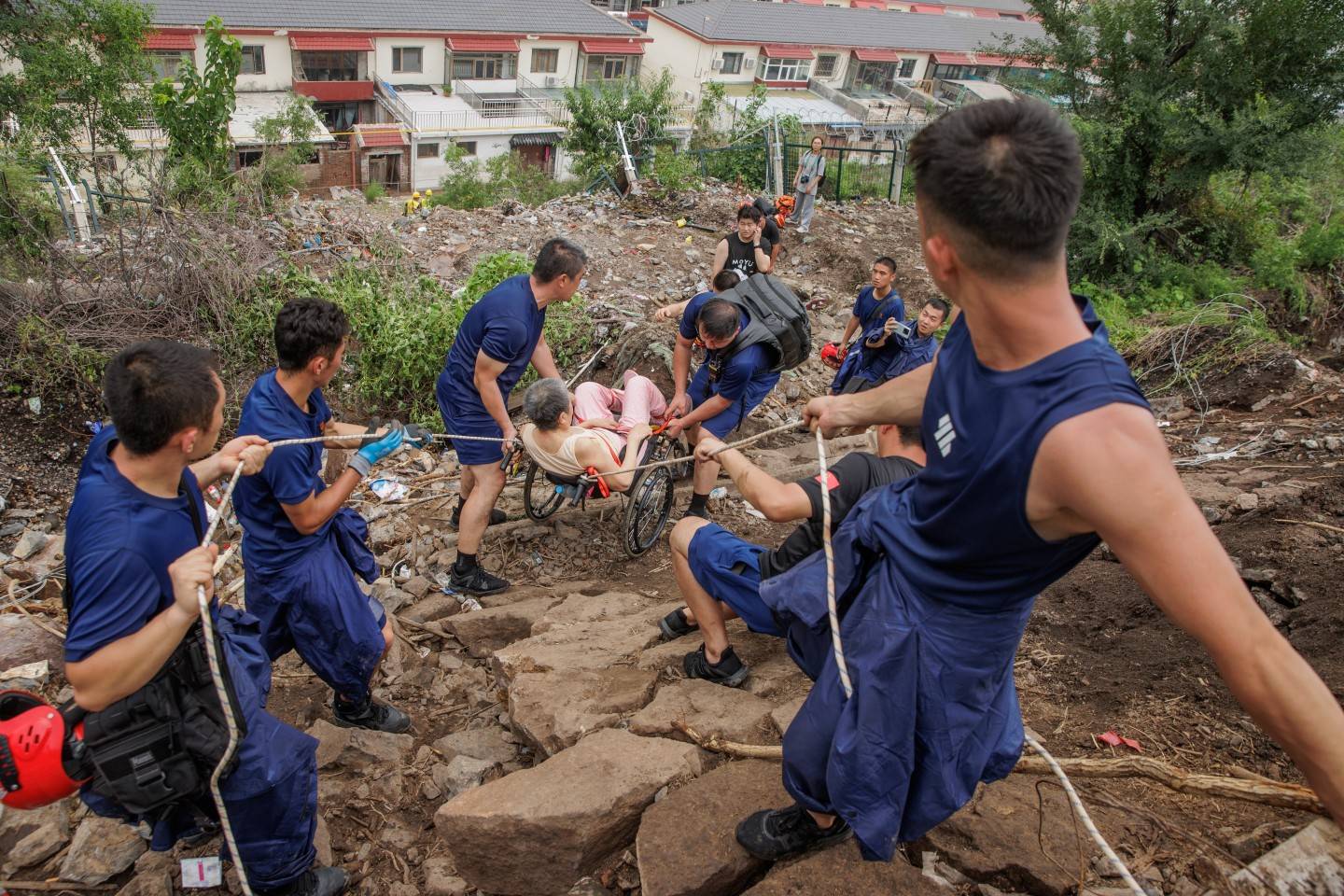 2023年8月2日,门头沟水峪嘴村附近山上,北京消防的队员们转运行动困难的老人。新京报记者 王子诚 摄