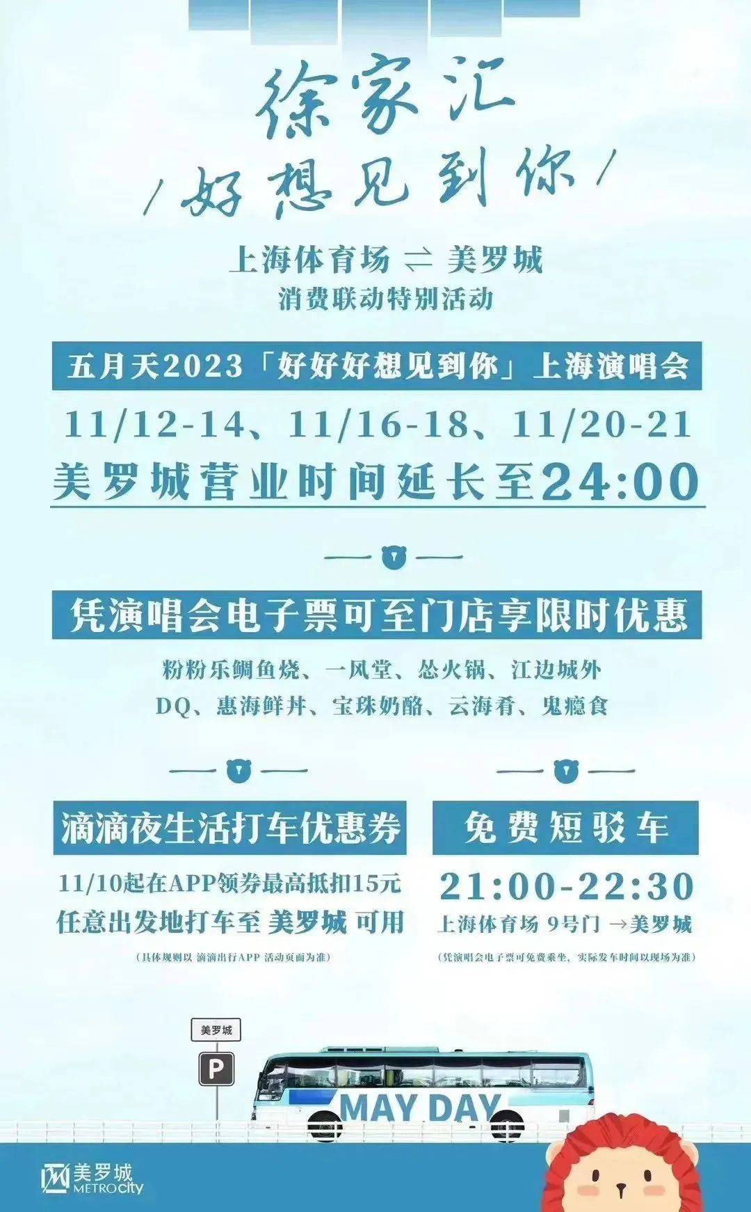 在演唱会结束后,美罗城贴心安排了专属短驳大巴车,上海体育场9号门开往T20大厦车道,不仅靠近商场,离1号、9号、11号地铁站也很近!