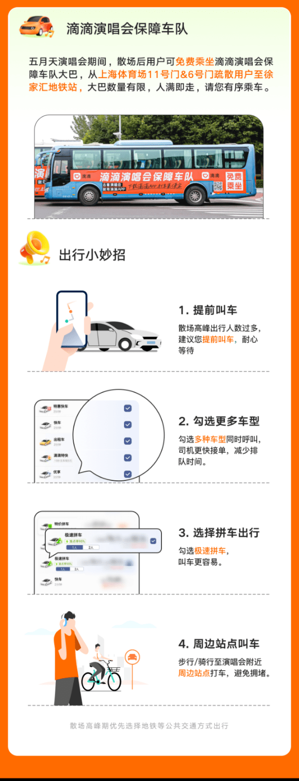 滴滴公司在每场演唱会后安排了6辆公益短驳大巴车,免费将有需要的观众“摆渡”至徐家汇商圈,方便观演群众搭乘公共交通离场。
