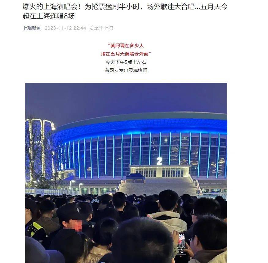 据上观新闻报道,当天五月天演唱会现场火爆,“嗨到起飞,全程蹦迪,都站起来了”、“连场外也一起大合唱”。同时,也有媒体报道称,五月天演唱会要“蹦起来看”。