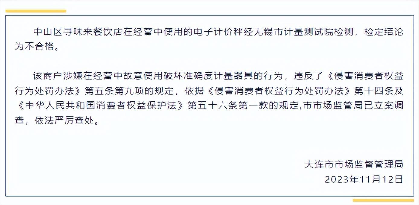 经初步查明,该商户存在经营中故意使用破坏准确度计量器具的行为,涉嫌违反《侵害消费者权益行为处罚办法》第五条第九项的规定,依据《侵害消费者权益行为处罚办法》第十四条及《中华人民共和国消费者权益保护法》第五十六条第一款的规定,大连市市场监管局已立案调查,并将依法严厉查处。