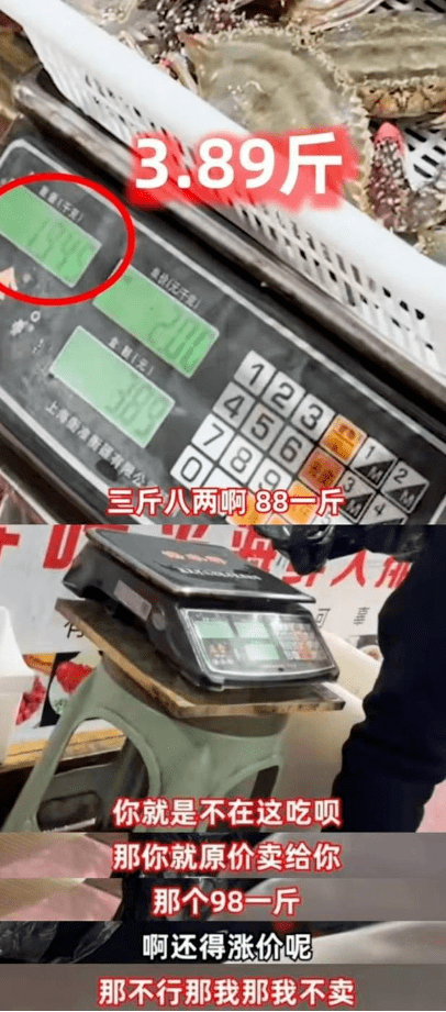 之后,“B太”又来到了一家海鲜餐厅,店内螃蟹标价88一斤,但在秤好后,因“B太”想带走,老板娘直接开口涨价,要卖他98一斤。