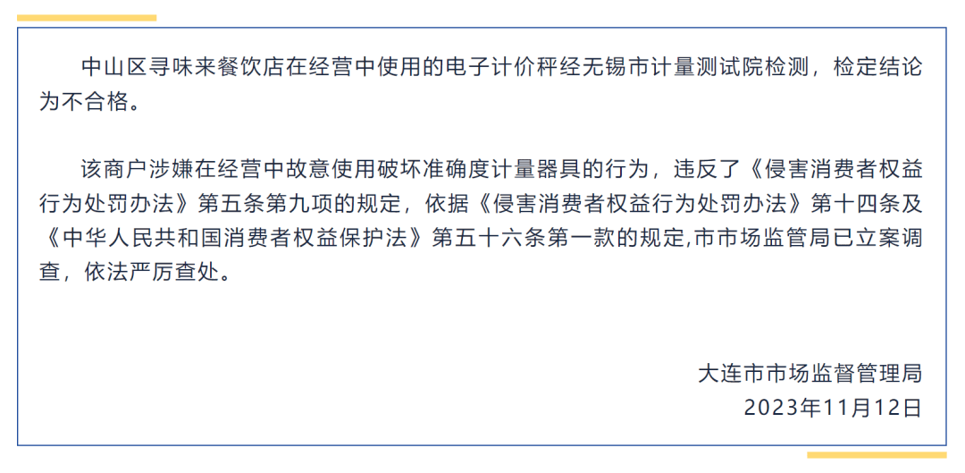 12日,大连市市场监督管理局发布案情通报,中山区寻味来餐饮店在经营中使用的电子计价秤经无锡市计量测试院检测,检定结论为不合格。