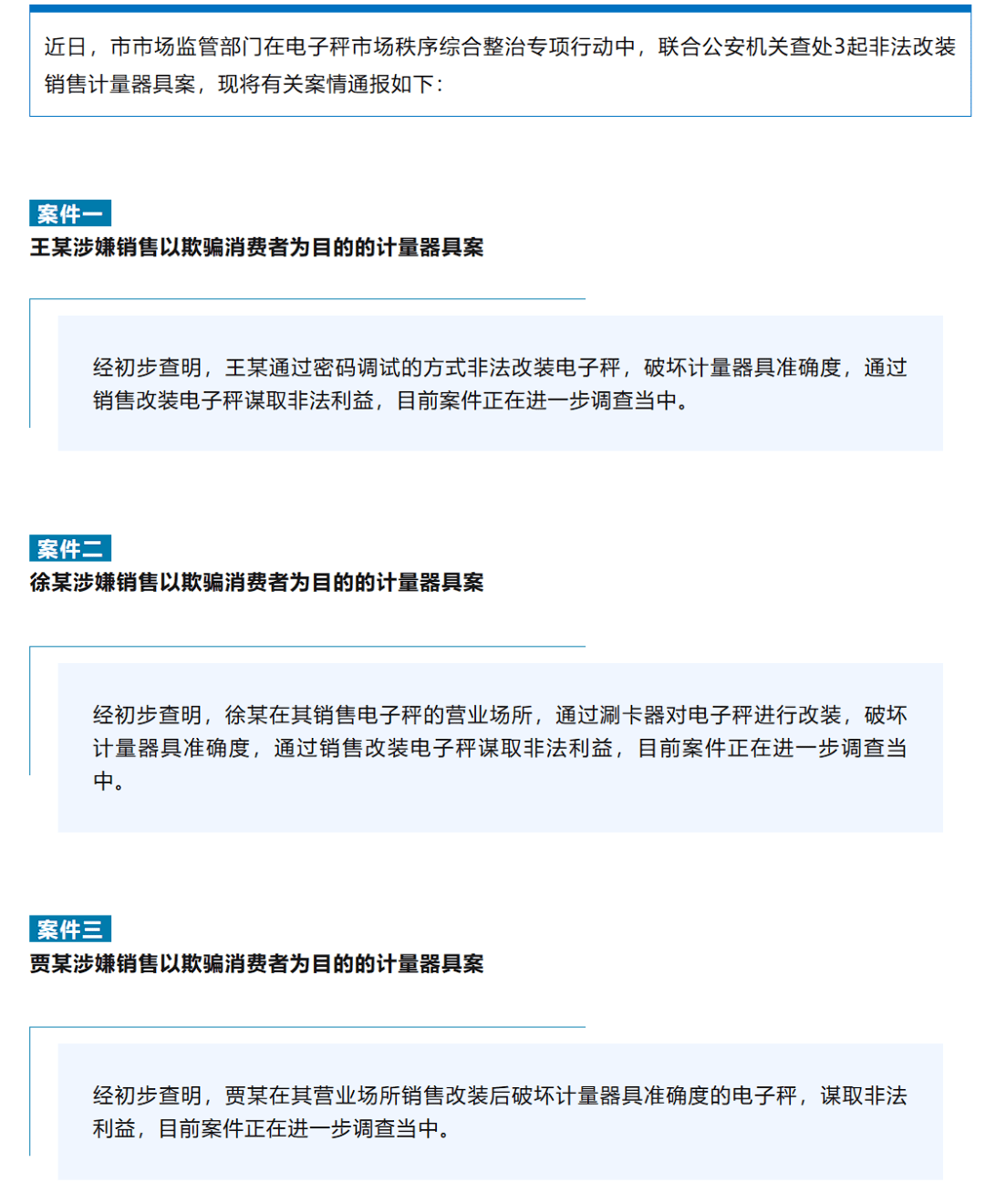 11日,大连市市场监督管理局发布通报称,近日,市市场监管部门在电子秤市场秩序综合整治专项行动中,联合公安机关查处3起非法改装销售计量器具案。其中,王某通过密码调试的方式非法改装电子秤;徐某在其销售电子秤的营业场所,通过刷卡器对电子秤进行改装;贾某在其营业场所销售改装后破坏计量器具准确度的电子秤。以上案件均在调查中。