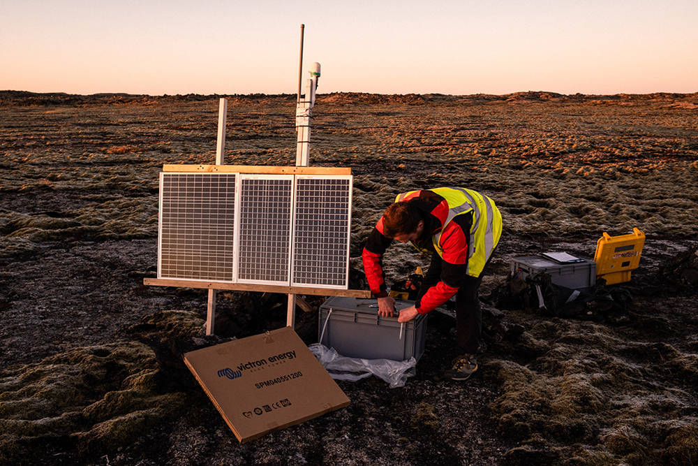当地时间2023年11月9日,冰岛雷克雅内斯半岛格林达维克镇,地震地质学家正在勘察。