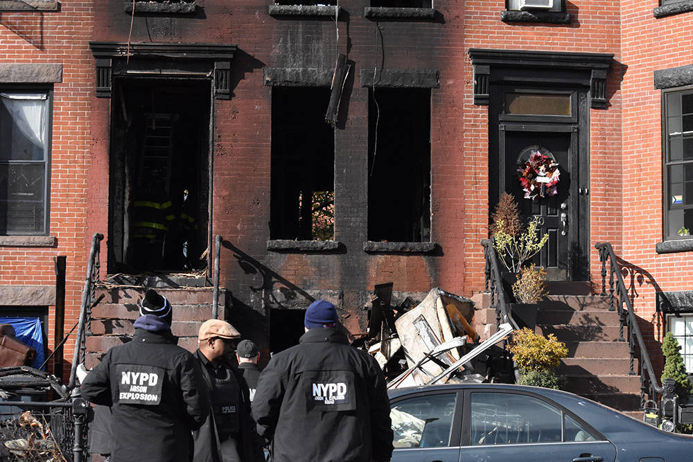 当地时间2023年11月12日,美国纽约市布鲁克林区,一栋住宅楼发生火灾,纽约消防局和纽约警察局在火灾现场开展调查。