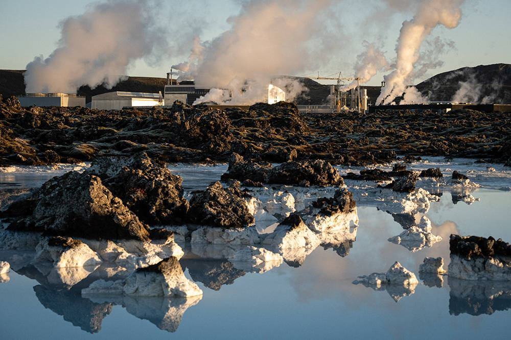 当地时间2023年11月9日,冰岛雷克雅内斯半岛格林达维克镇,蓝湖地热温泉旁边的地热发电站。
