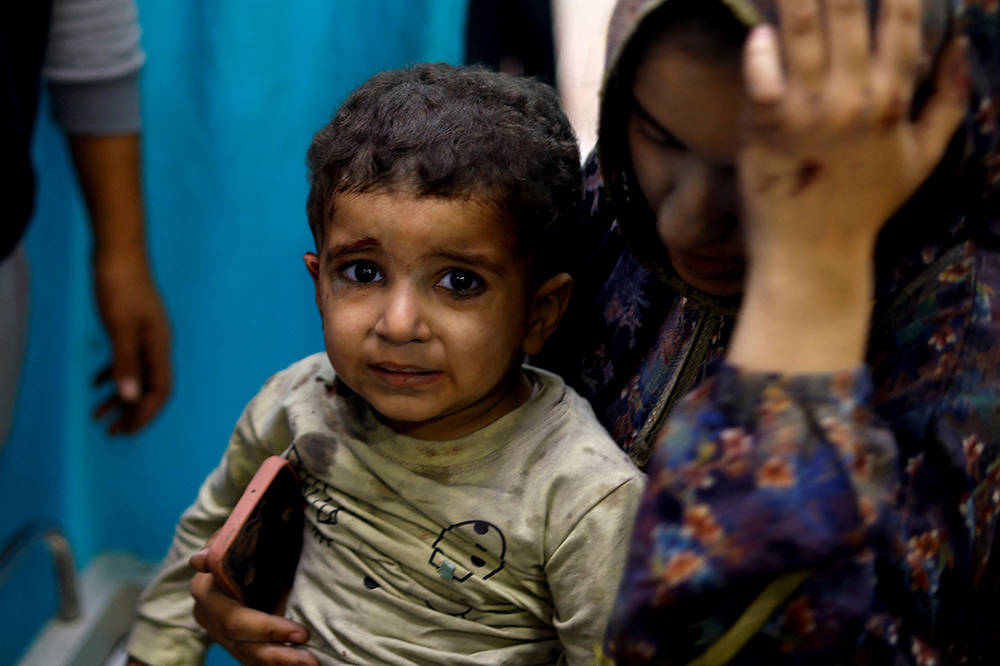 当地时间2023年11月12日,加沙地带南部汗尤尼斯,当地遭以色列袭击后,一名受伤的男童在医院内等待治疗。