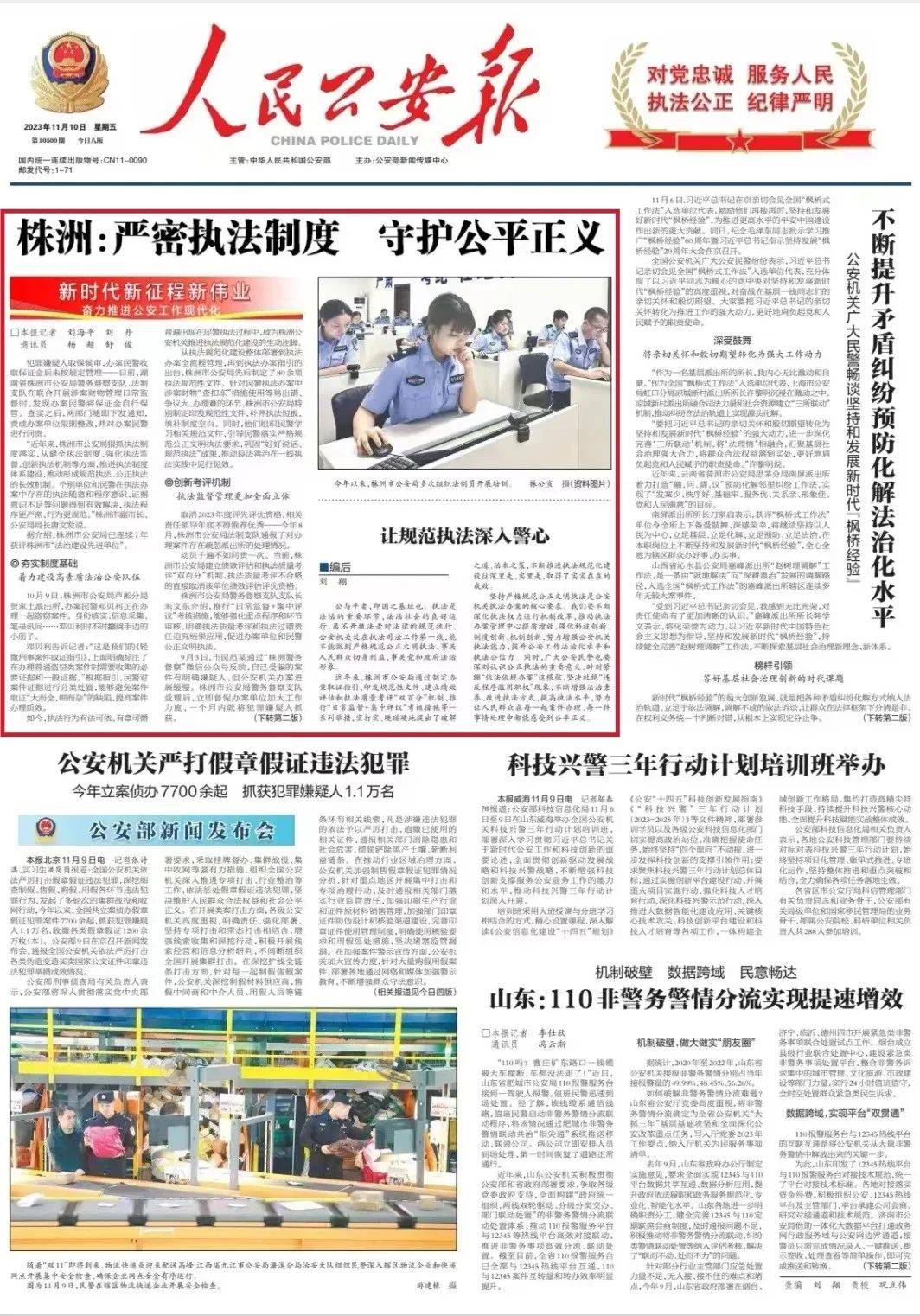 11月10日,《人民公安报》头版头条刊发《株洲:严密执法制度 守护公平正义》,宣传推介株洲公安通过多项举措规范执法、公正执法,严密执法制度,不断推进执法规范化建设走深走实的先进工作经验,现予以转载。