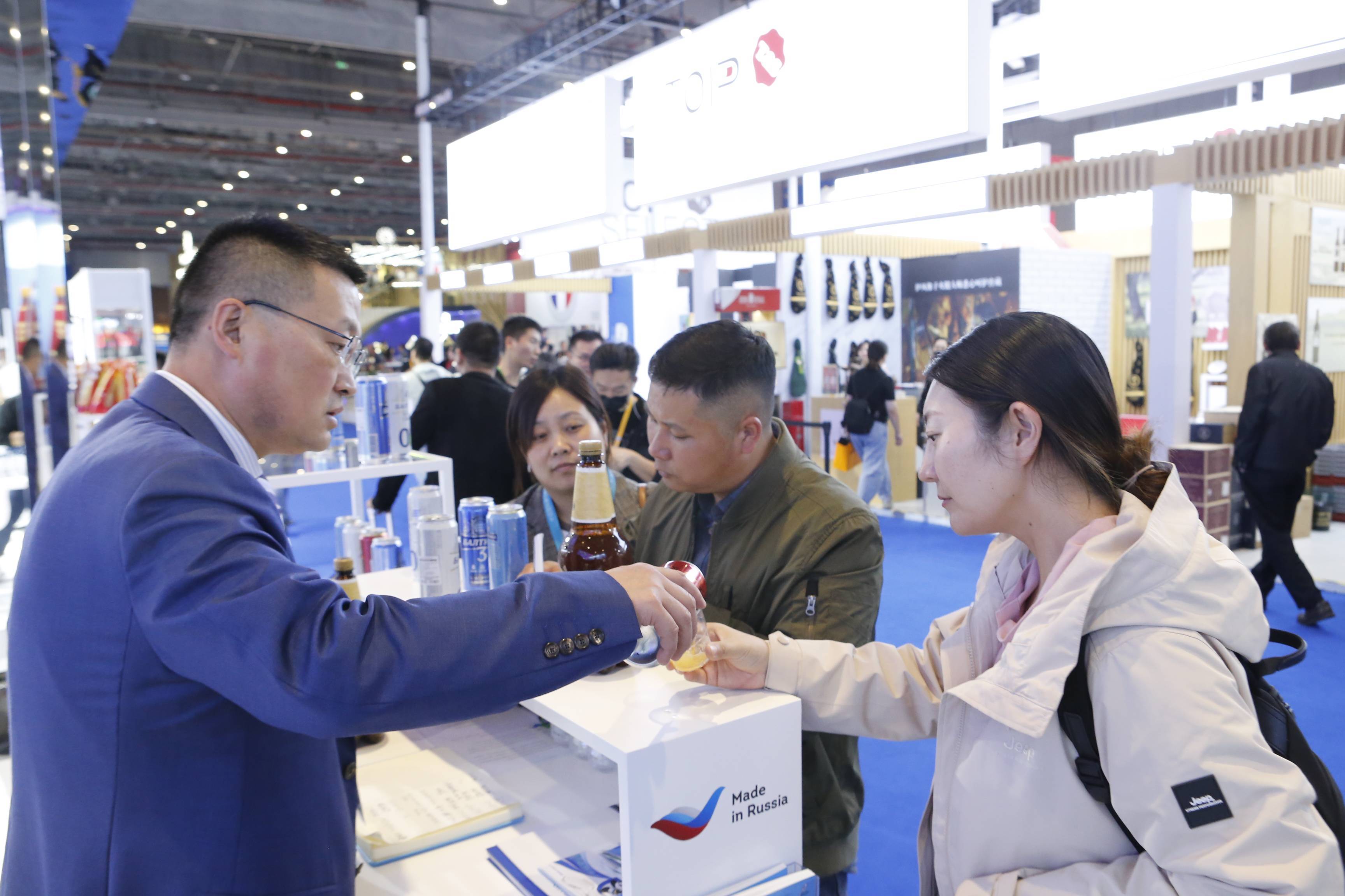 11月7日,在第六届进博会食品及农产品展区俄罗斯出口中心展台,参观者品尝来自俄罗斯的波罗的海啤酒。(新华社)