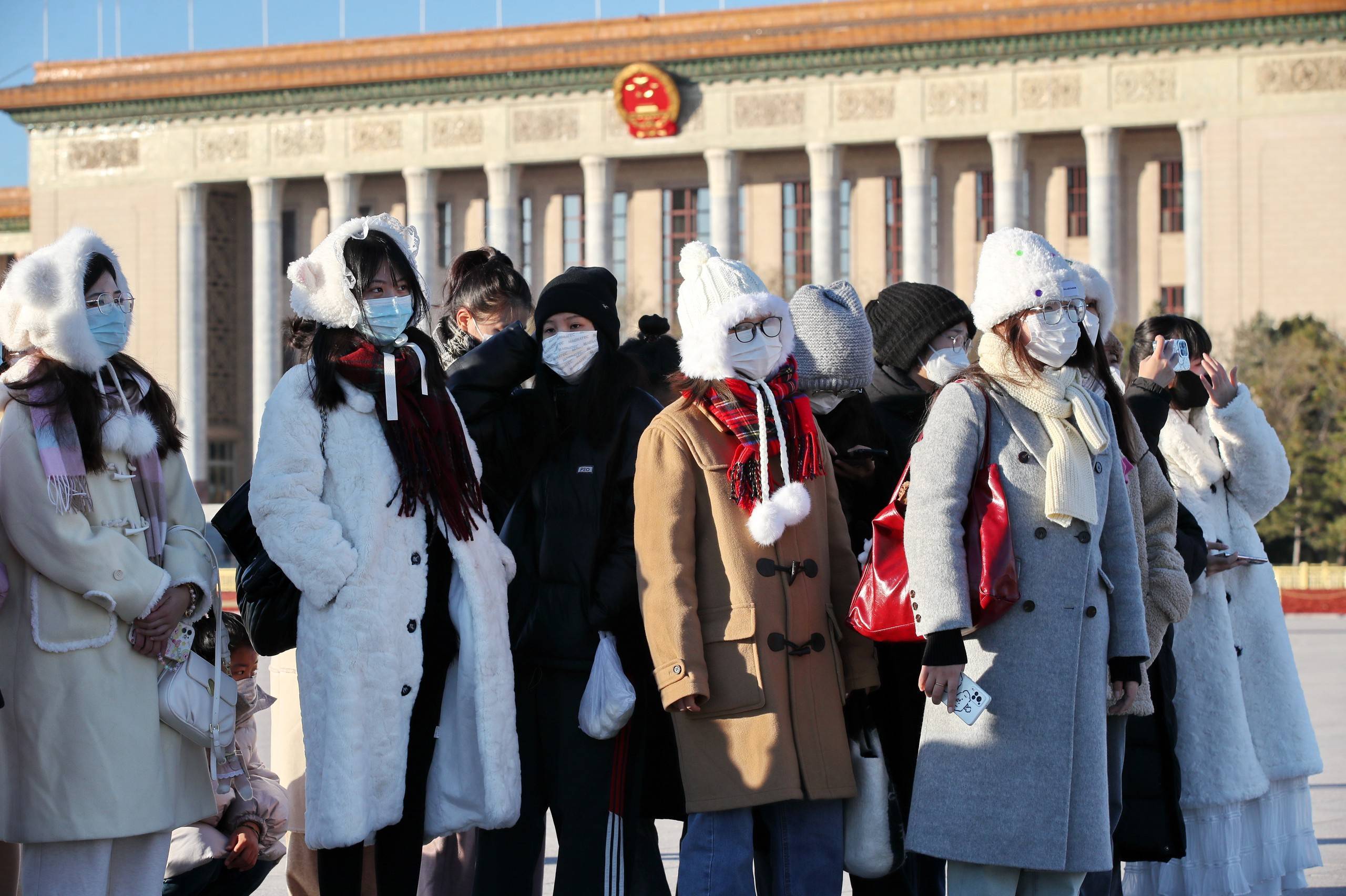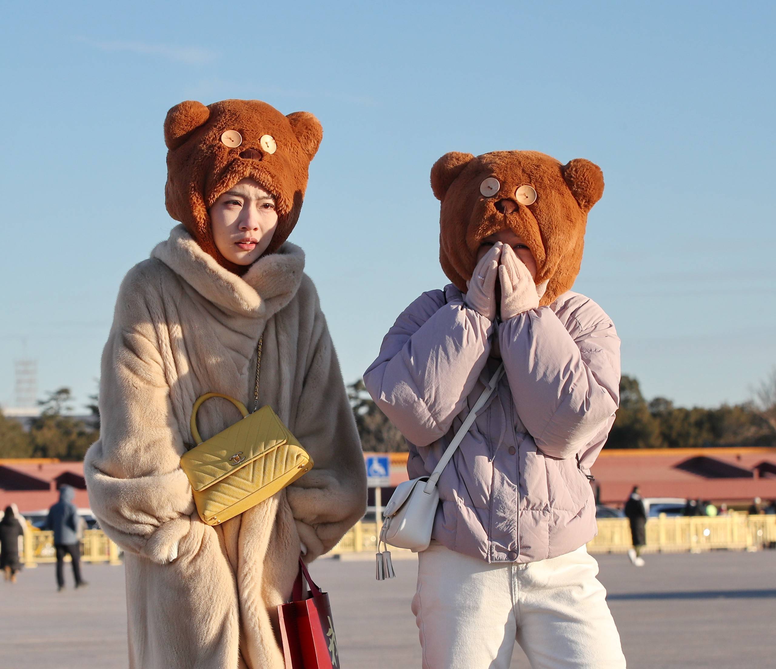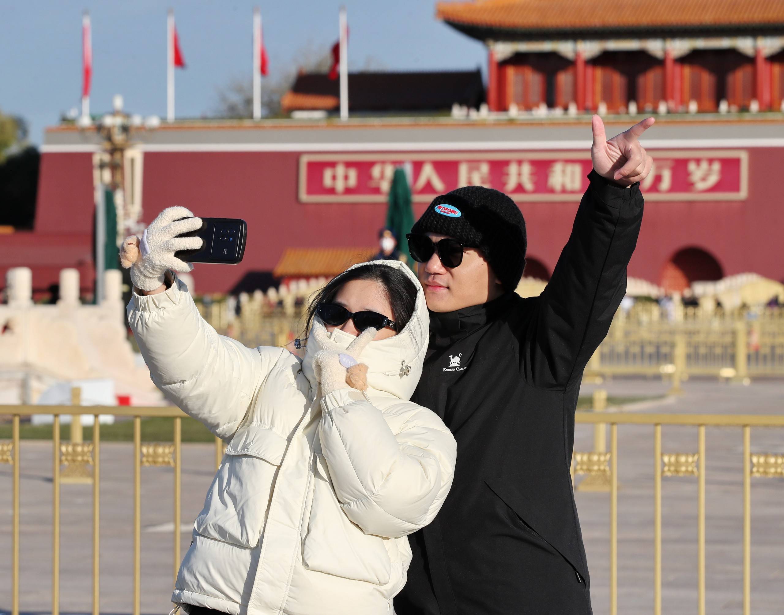 2023年11月28日,北京,游客“全副武装”游览天安门广场热情不减。