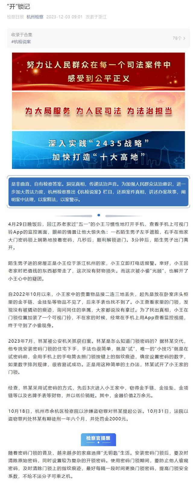 10月18日,杭州市余杭区检察院以涉嫌盗窃罪对林某提起公诉。10月31日,法院以盗窃罪判处林某有期徒刑一年六个月,并处罚金2000元。
