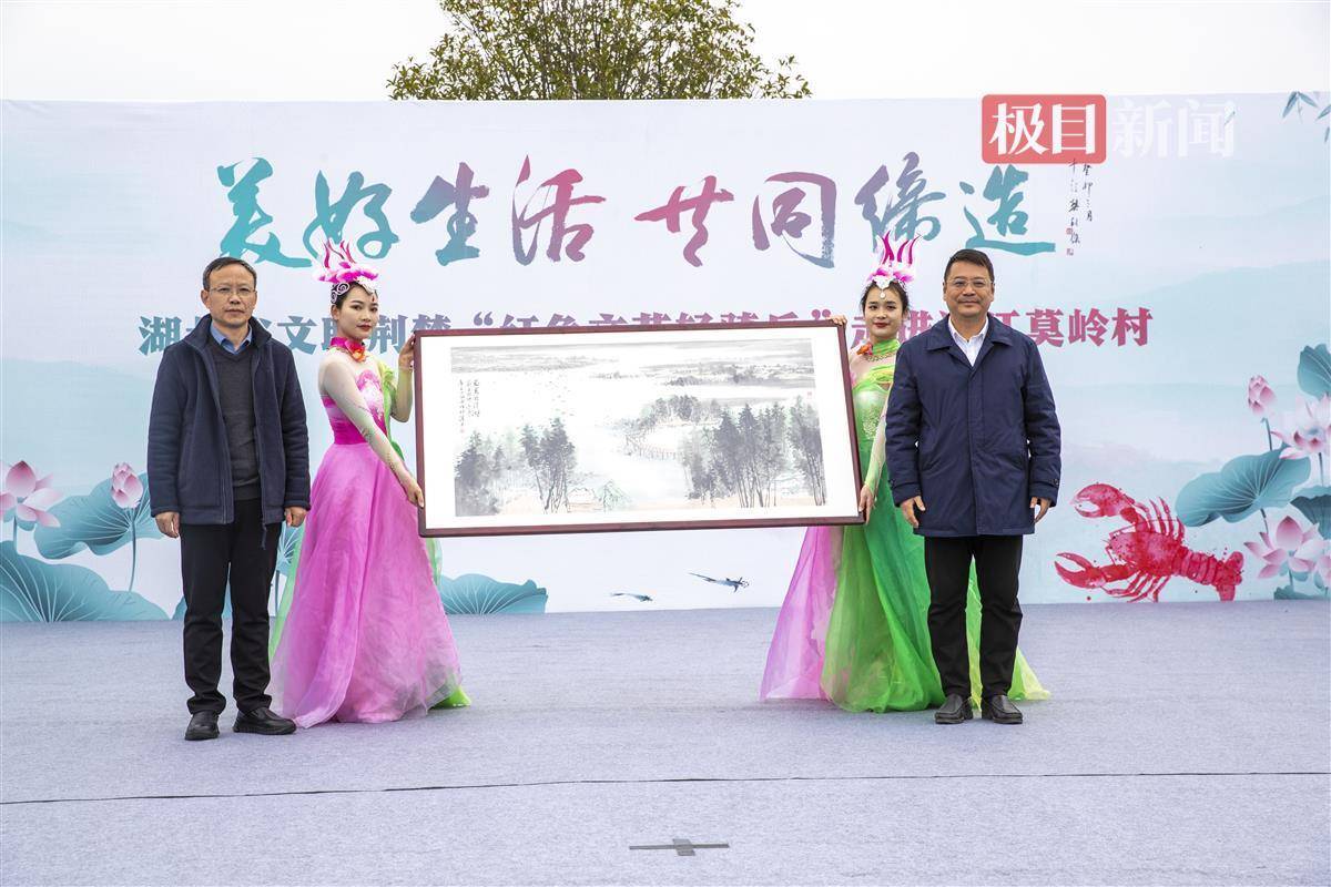 本次活动还开展了摄影、书法、美术作品赠送环节,由湖北省摄影家协会会员、省摄协优秀志愿者陈利安向潜江市后湖管理区最美志愿者朱瑾、潜江市后湖管理区关庙分场谷里花韵家庭农场场长肖诗兵、潜江市后湖管理区老党员柳宗贵三位先进典型人物赠送摄影作品。由湖北省文联文学艺术院副院长、湖北省国画院书记李平和中国美术家协会会员、湖北省国画院常务副院长黄少牧共同创作的国画《最美返湾湖》赠送给后湖管理区。由中国书法家协会会员、湖北省书法家协会副主席、武汉书法家协会主席瞿忠谋赠书法作品《中国虾谷·莫岭村》和《潜江龙虾 红遍天下 世界共享》给莫岭村和潜网集团。
