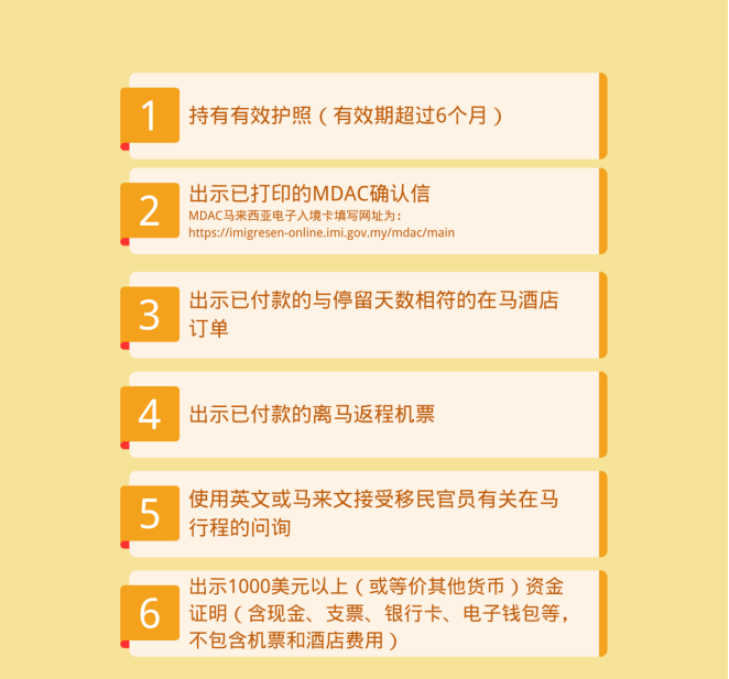 二、为确保来马中国公民入出境顺畅,中国驻马来西亚大使馆在此温馨提醒如下:(一)请来马中国公民提前了解和遵守马来西亚入出境政策和相关法律规定(马来西亚移民局官方网站:https://www.imi.gov.my/index.php/en/main-services/syarat-kemasukan-ke-malaysia-en/),按照马方要求提前准备好相关入境材料。如未能备齐材料,可能会对您顺利入境造成影响,甚至移民官员将根据当地法律法规拒绝您入境。(二)入出境时请配合移民官员工作,主动出示相关材料,耐心沟通解释,如有沟通障碍,可请同行旅客或航司工作人员协助。 (三)进入马来西亚从事学习、工作等须马方主管部门事先批准的活动,或拟停留超过30天的,仍应按要求在入境前申请与入境目的相符的签证。