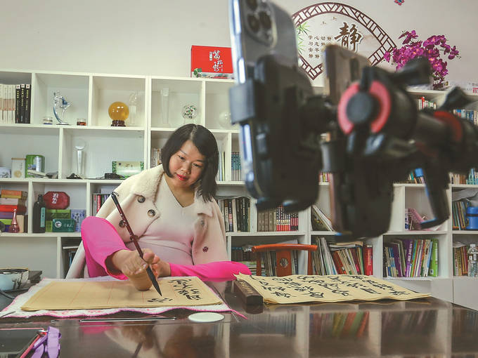 12月1日,连云港市海州区浦南镇富安村居民纪苏原在直播用脚书写毛笔字。纪苏原自幼失去双臂,她勇敢面对,在党和政府惠残政策的帮助下,创立帮扶中心和爱心文化传媒公司,书写身残志坚、服务社会的人生路。 王健民 摄