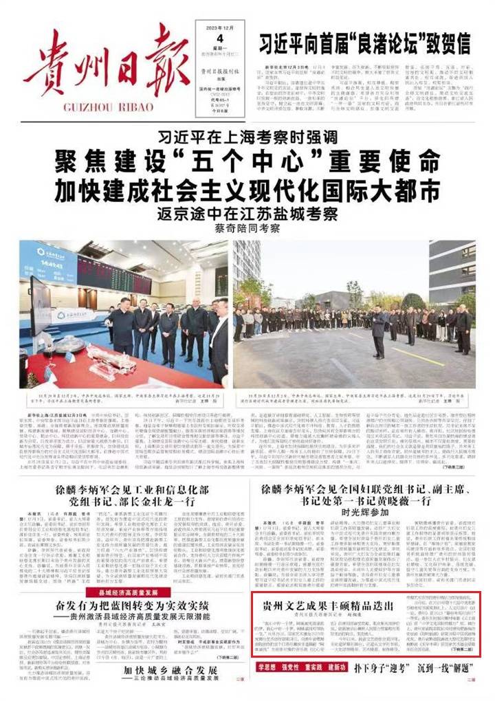 贵州出品的《丁宝桢》《大道薪火》等电视剧,在央视一经播出便稳占收视率榜单;书画创作佳作迭出,《山里江南·桃花艳》等9件作品入选全国优秀美术、书法篆刻作品展,“多彩贵州”美术大赛投稿总数达1300余件,艺术家们用美术作品描绘时代旋律;艺术门类精彩荟萃,黔剧《腊梅迎香》获“文华大奖”提名剧目,并受邀登上国家大剧院,花灯剧《红梅赞》受邀参加第三届全国戏曲(南方片)会演,京剧《阳明悟道》赴上海演出争夺白玉兰奖,三度获得国家艺术基金资助的交互式民族音画作品《高原·听见贵州》在全国巡演10场……一大批精品剧目频频亮相,贵州文艺创演水平持续提升。
