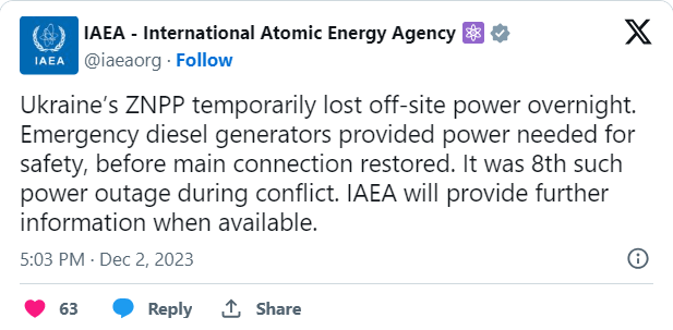 国际原子能机构总干事拉斐尔·马里亚诺·格罗西说:“乌克兰所有的核设施仍然很脆弱,要么是直接被导弹击中,要么是间接的,如果它们的场外电力供应中断的话。”