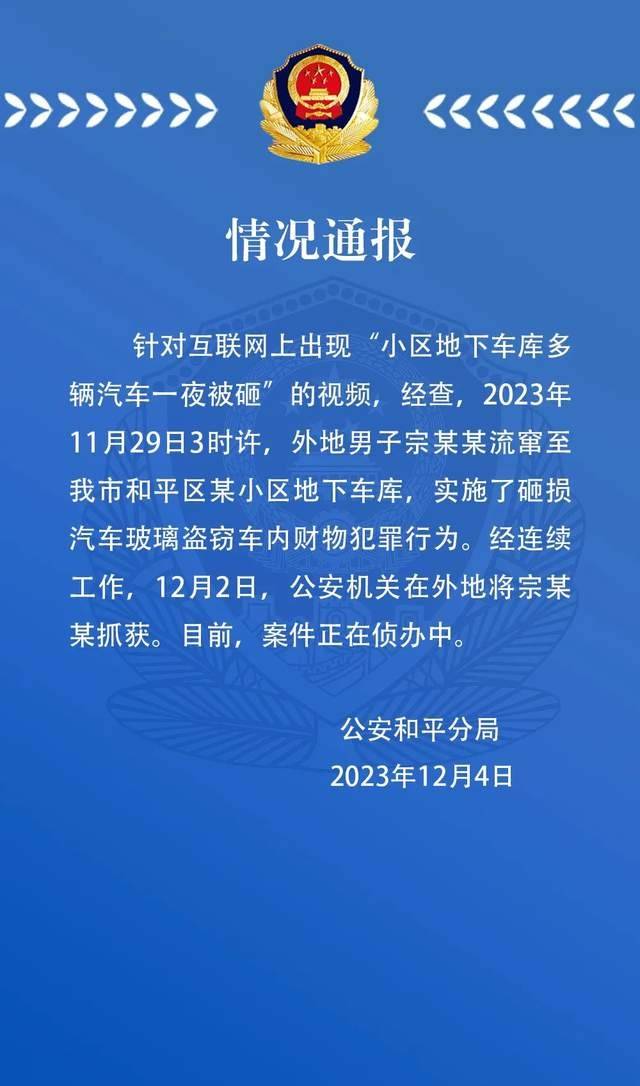 12月4日,据平安天津消息,针对互联网上出现“小区地下车库多辆汽车一夜被砸”的视频,经查,2023年11月29日3时许,外地男子宗某某流窜至我市和平区某小区地下车库,实施了砸损汽车玻璃盗窃车内财物犯罪行为。经连续工作,12月2日,公安机关在外地将宗某某抓获。目前,案件正在侦办中。
