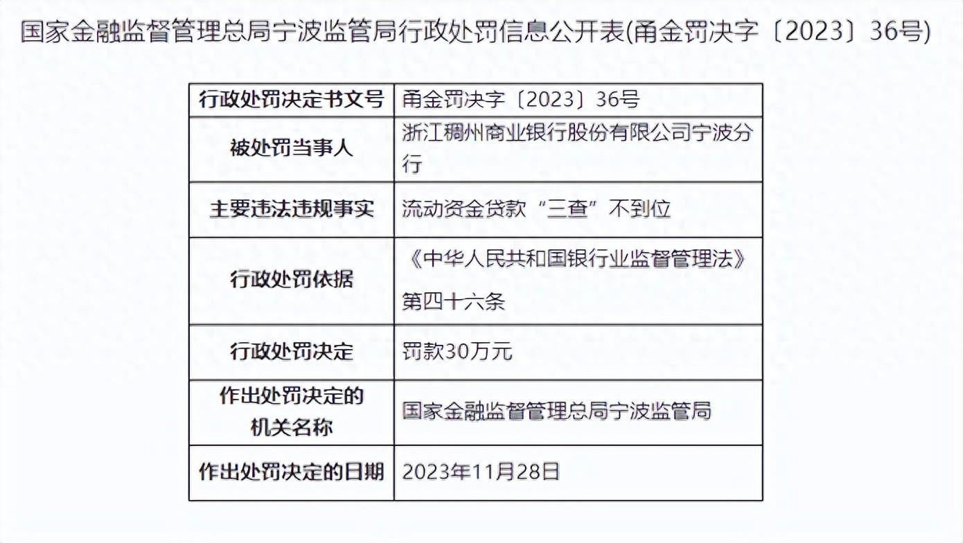 原标题:浙江稠州商业银行宁波分行被罚30万元,涉贷款“三查”不到位