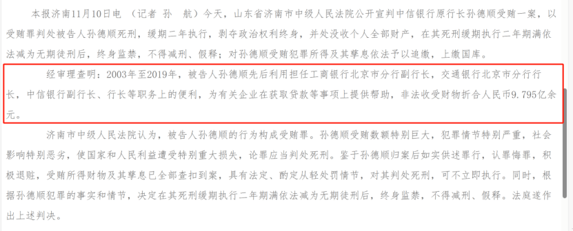 原行长孙德顺,2003年至2019年的16年间,受贿近10亿元,被判无期徒刑,终身监禁,不得减刑、假释。