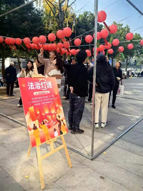 在“法治灯谜”活动现场悬挂起红色灯笼,灯笼下是一个个有趣的法治灯谜,参与者取下灯谜向工作人员说出答案,正确即可获得纪念品,工作人员结合灯谜内容与参与者互动交流,让“学法明辨是非、守法维护权益、用法定纷止争”的道理在妙趣横生的猜谜活动中深入人心。