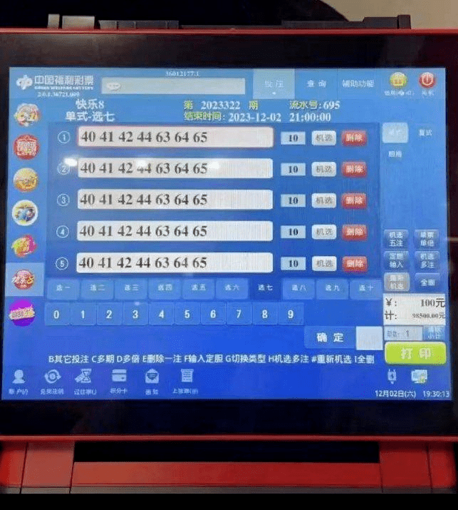 网传的终端机截图显示,12月2日,有人在“快乐8”选七玩法中,一次性购买“40、41、42、44、63、64、65”数共98500元(49250注)