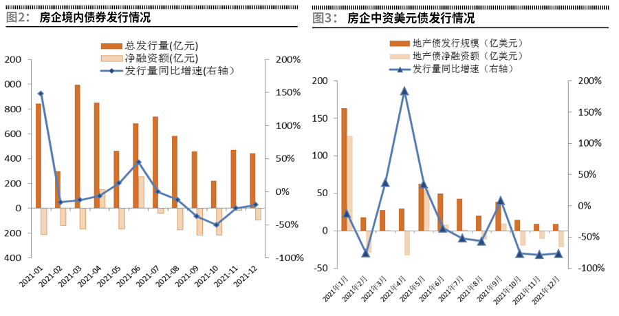美联储12月议息会议决定从2022年1月起将每月缩减购债规模由150亿美元增加至300亿美元,于一季度结束QE,点阵图显示美联储预计2022年将加息三次。若加息节奏提前,将导致美债利率中枢上移,并抬升企业融资成本,叠加2022年中资美元债到期压力较大,将考验企业的现金流状况及债务接续能力,需警惕中资美元债市场风险向境内债市传导。特别是目前房地产行业债务危机尚未完全解除,地产美元债偿付压力加剧,可能导致弱资质房企资金链断裂,美元债融资依赖度高的房企将面临更大的挑战。