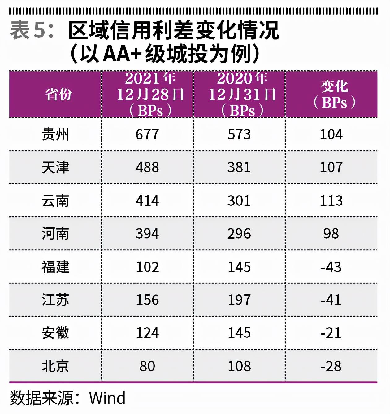 由于非标到期接续困难,城投企业的再融资风险上升,2021年城投非标违约事件频发。企业预警通数据显示,2021年共发生26起城投非标违约。从地区分布来看,城投企业非标违约分布在9个省份。其中,贵州省违约12只(占比46%),重庆违约3只,天津、云南、河南、广东各2只,其他省份违约数量相对较少。非标违约地区的城投信用利差大幅攀升,机构一致抱团优质地区城投,加剧了不同区域之间的信用分化。